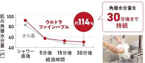 【実験条件】シャワーを使用して前腕部に10L/分、20秒の条件で試験水を流水。その後、前腕部の角層水分量を、シャワー直後からシャワー30分後まで経時的に測定。試験水:水道水、水温:40℃、被験者:成人女性16名※出典:早坂信哉、古川真也、松枝和輝:ウルトラファインバブルを含むシャワーの角層水分量・保湿への影響、日本健康開発雑誌、2023 Vol.44 p55-60