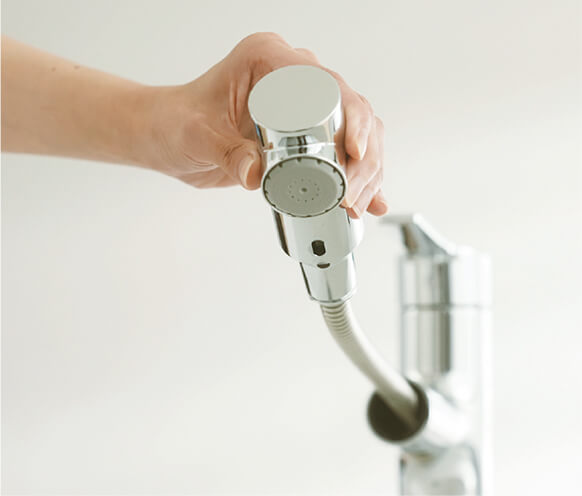 ホースが引き延ばせることはもちろん、スパウトを左右に動かせる「首振り機能」を搭載。可動域が広いので、お掃除や洗髪などの際もスムーズです。