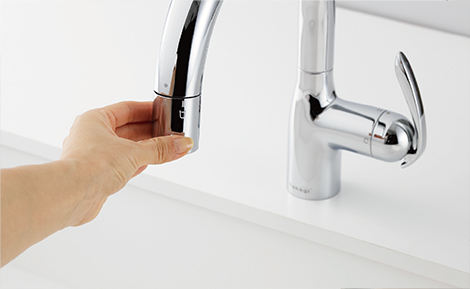 手元で水形が簡単に切り替えられるシンプルなダイヤル式を採用。手際良い家事の動作を妨げません。