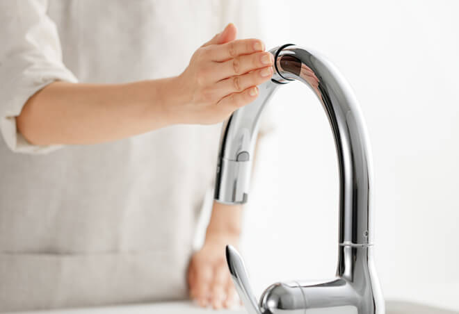 スパウト側面にセンサーがあるから、手をかざした時に水や洗剤が垂れにくく、水栓を拭く手間も省けていつもきれいに保てます。